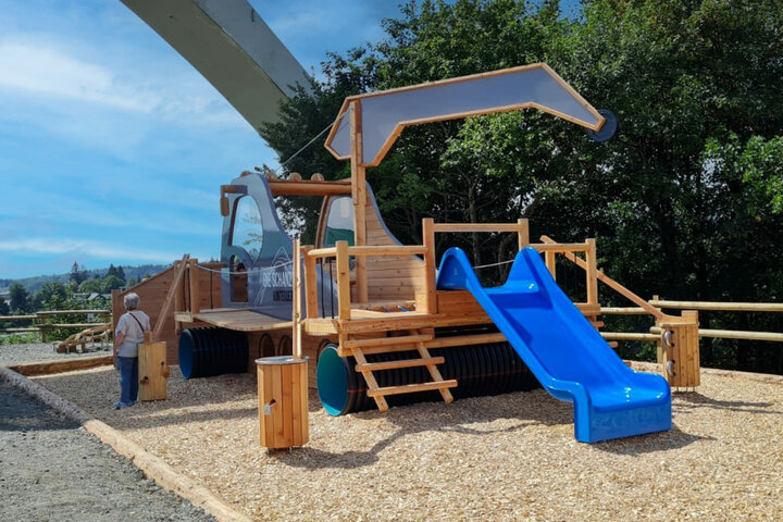 The wooden play equipment in Winterberg is located in the "Schanzengastronomie" area, directly under the ski jump - "THE landmark of the town". Side platforms made of suspension bridge elements, a cockpit with steering wheel and benches for drivers and passengers, a wide blue slide, tubes to crawl through, climbing net and climbing wall on the shield: in addition to these standard features, four elements from the modular system for Wooden Ball Track were added, such as a funnel and looping. These offer even more play opportunities and excitement elements (movement and sound/noise) on and around the equipment. The outside and winch arm of the snow groomer are finished in the gray of the customer design and feature the logo.