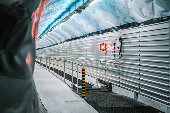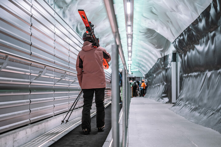 Last fall, a conveyor belt from Borer Lift AG was installed in a special place. In the connecting tunnel on Felskinn 3000 m above sea level, where ski tourists can get from the two feeder lifts Alpin Express and the aerial tramway Felskinn to the underground funicular Metro-Alpin above Saas-Fee, the flat path to the entrance of Metro-Alpin is now comfortably facilitated by a 76.5 m long conveyor belt. The conveyor belt is monitored from the funicular's bottom station. Four cameras provide the funicular staff with total surveillance of the route. In summer and autumn, countless alpine training ski teams from all over the world can be found on the glacier above Saas-Fee. In the morning of the day, the conveyor belt is used in the direction of the funicular, and when the skiers return, it is set in the opposite direction so that the athletes can easily get to the downhill transport facilities. 11 kW are enough to ensure the transport of the 75 cm wide conveyor belt.