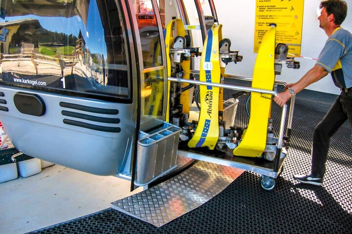 Grâce à l'utilisation de chariots de transport spéciaux adaptés au type de cabine existant, il est facile de transporter jusqu'à trois luges à la fois par cabine. De plus, il est possible de fixer les luges à l'extérieur de la cabine, ce qui évite de perdre en capacité.