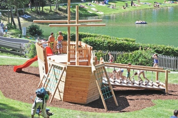 À l'exemple du terrain de loisirs de Ried, la thématisation de deux équipements de jeux se rattache au lac de baignade situé à proximité immédiate. D'une part, le bateau de jeux qui combine de nombreux équipements de jeux et qui se passe de fondations à enterrer. Que ce soit en tant que capitaine de pirates, pionnier d'un navire d'expédition ou capitaine de bateau de rêve, le bateau offre aux enfants un cadre idéal pour leurs jeux imaginatifs. La cabane d'aventure est également un point d'attraction spectaculaire pour les enfants : sa conception insolite stimule l'imagination des enfants qui y jouent. Peut-être s'agit-il d'un repaire de pirates dans lequel les trésors conquis sont entreposés ? L'offre est complétée par le "Adlerhost" qui s'élève dans les airs ainsi que par la puissante balançoire Goliath.
