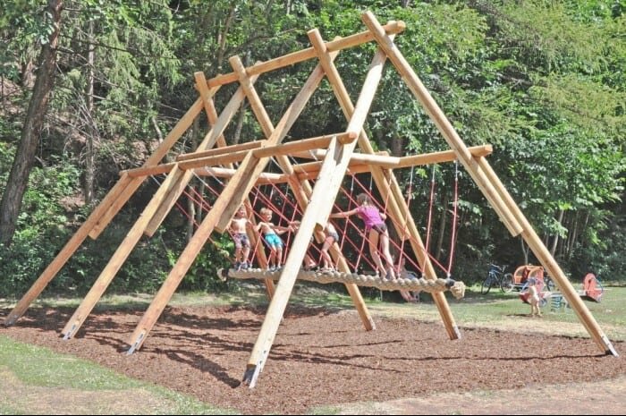 Le bois, matériau central, ne se distingue pas seulement par ses propriétés optimales pour l'utilisation sur les aires de jeux, mais permet également aux équipements de s'intégrer discrètement dans le paysage.