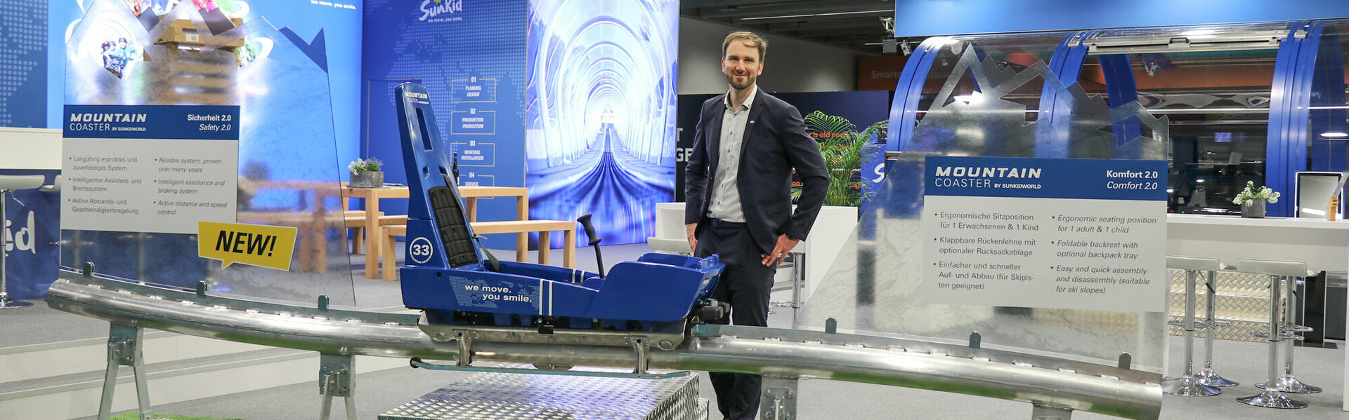 Sunkid unveiled the Mountain Coaster 2.0 at the leading trade fair INTERALPIN (April 19 - 21, 2023, Innsbruck, Austria), setting new standards in safety, comfort, fun as well as efficiency - and at the same time meeting the increasing demands of our customers in terms of individual theming and year-round operation.