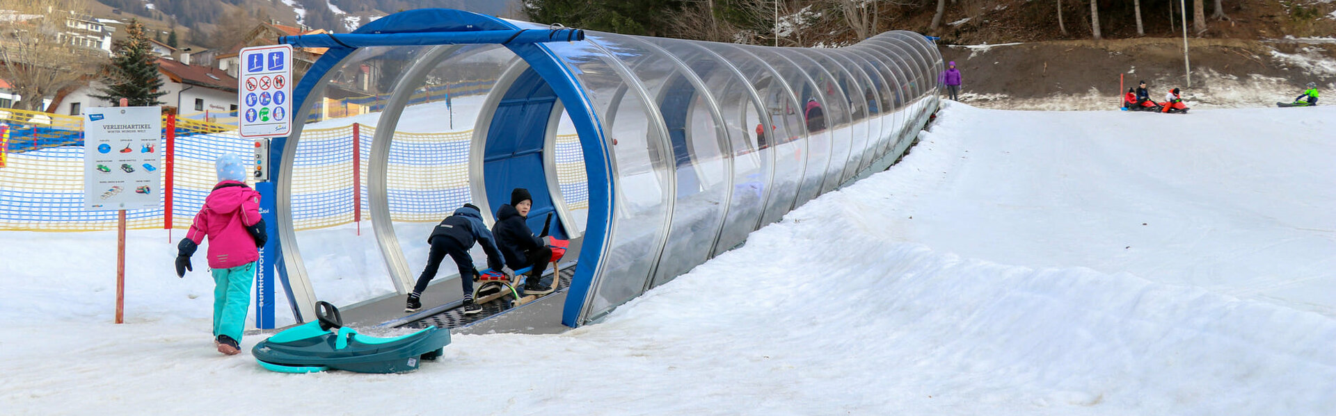 In the center of Nauders am Reschenpass, "lots of snow fun for all ages" awaits on 16,000 square meters below the illuminated Naudersberg Castle. In addition to ice sports activities and alpine hut catering, sliding on snow - without skis - is at the center of the "WINTER WUNDER WELT".