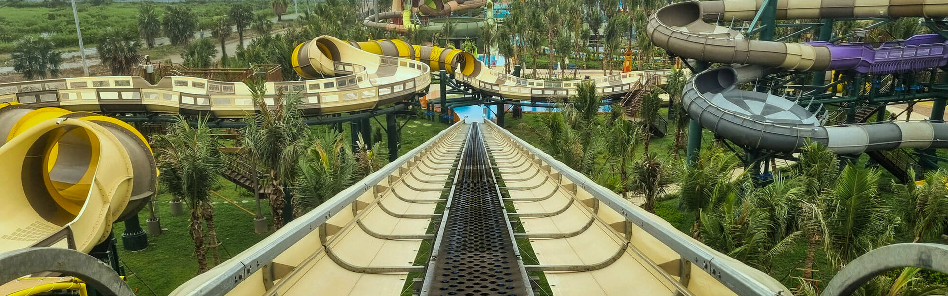 As with the large-scale project "Sam Son" (project report), the leading Vietnamese property developer - the Sun Group - awarded the huge project (40 slides and 10 themed park areas) to the internationally renowned manufacturer and developer of water attractions - ProSlide. Sunkid supplied two "Raft Return Conveyors" and one "Cleated Raft Return Conveyor" - individually adapted to the respective slide tires to be transported - with lengths of 38, 40 and 84 meters.