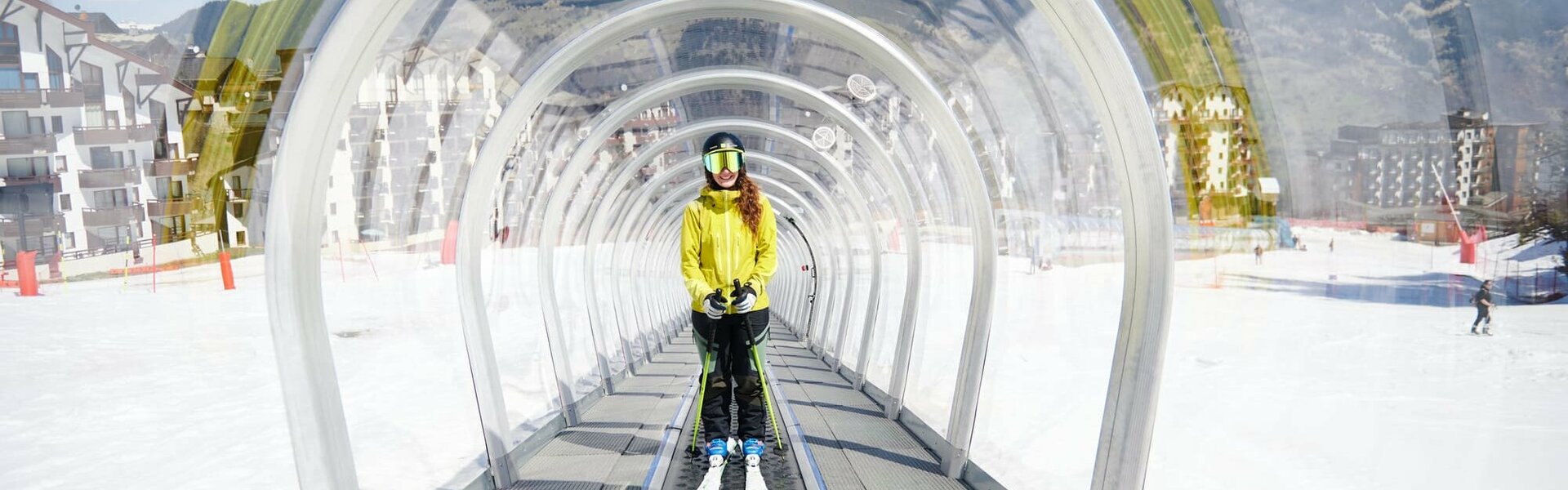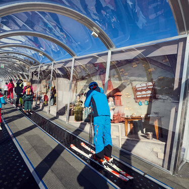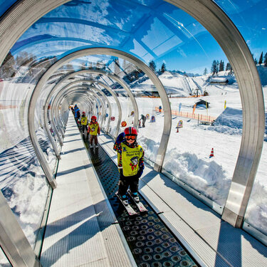 The advantages of the Sunkid Gallery are obvious: Less effort in maintenance and operation of the system increase operational safety and save costs. Increased comfort for your guests through protection from wind and weather. Countless possibilities for theming and design or for marketing purposes. Sunkid galleries for your Moving Carpet can not only be retrofitted, but are also suitable for many other applications: Gathering point ski children's land, covered panoramic rest areas, roofing of paths and bridges, and much more.