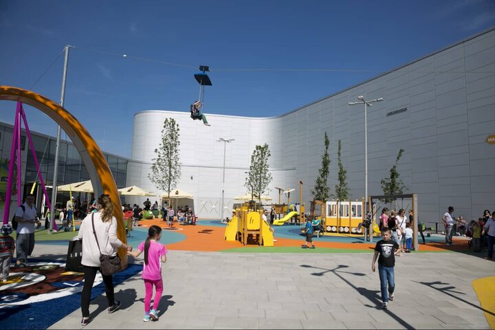 In the newly built shopping center Bory Mall (Bratislava/Slovakia), the largest play tower in Central Europe was built for the children in the outdoor area. On five floors, children can let off steam on various play and climbing equipment, tunnels and a wide variety of slides. Even an integrated tubing track, there called Donut Glider, opens up a completely new sliding experience for the children.