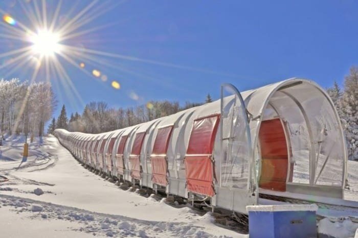 The Sunkid Gallery can be installed on any model of Sunkid Moving Carpet and can also be retrofitted to existing installations. Due to the proven modular design, concave and convex terrain is no obstacle for the Sunkid Gallery. High-quality UV-resistant 3 mm thick polycarbonate panes, an interior width of 2.2 m, and an interior height of 2.3 m ensure a spacious feeling. Due to self-retracting tarpaulins at the exits, the opening of the gallery works easily, simply and quickly even at low temperatures, including gloves. In the valley and on the mountain of the facility, the gallery is closed overnight by means of lockable gates.