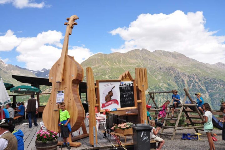 Before the craftsmen got down to work building the attractions and play equipment, the cooperation partners Input and Sunkid thought about how the stations on the trail could best be designed in terms of content. The result was appropriate themes with names like "Nature Time," "Play Time," "Music Time" and "Water Time. Visible signs of ALMZEIT SÖLDEN for the hikers are, for example, an oversized double bass, an outdoor skittles game, a "climbing antler", three large climbing crystals or an 800 kilogram mountain shoe.