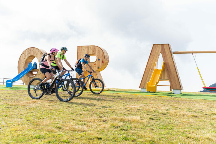 A climbing wall with soft floor mats, two slides, three swings (a nest swing as well as two hanging seat child swings): The newly created letter playground invites the little guests to scramble and romp while the rest of the family enjoys the mountain panorama of the Bergamasque foothills. In summer and winter, the M-PORA lettering makes its way into many photo albums and social media galleries as a photo motif.