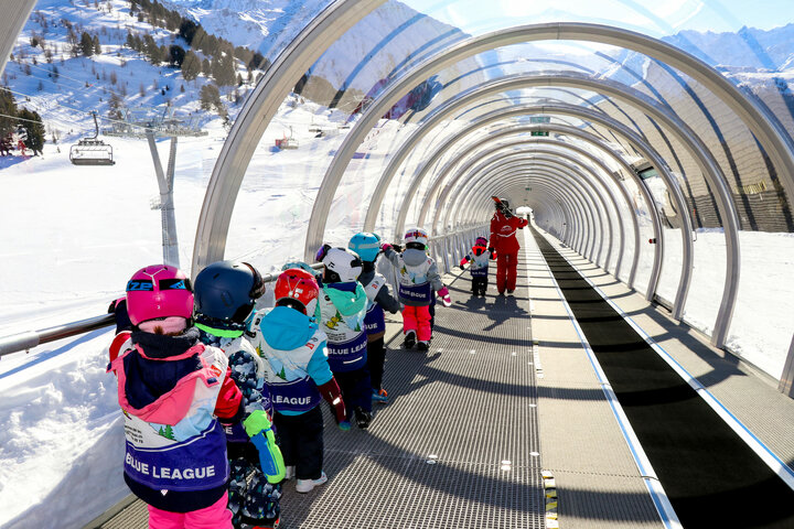The new, ultra-modern duplex facility acts as a child-friendly, easy return from both the ski area and the "Kids park Tracouet", which is located a few meters below the gondola mountain station. Ski School children walk there with their teachers or parents next to the Moving Carpet. Specially anti-slip coated gratings ensure a safe descent - at the steeper start of the wide walkway, young and old can find additional support on a handrail.