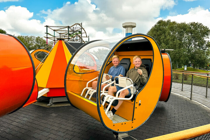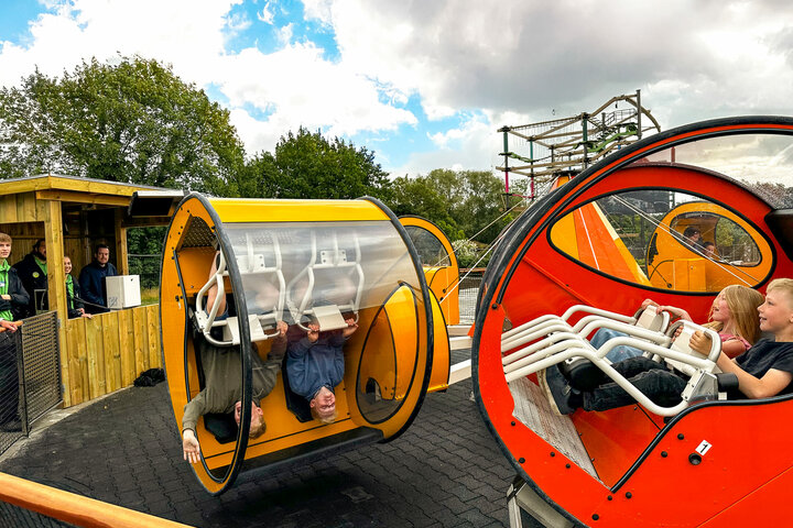 The 8-cabin version of the Loopster, with its eye-catching yellow and orange design, is a so-called "space spinner" that thrills up to 480 passengers per hour. By pressing buttons on the restraining device, the passengers themselves decide the direction of rotation (forwards and backwards) as well as short upside-down breaks. The aim of the park is to bring rotation and centrifugal force to life with the Loopster: "We'll turn you upside down - if you dare! [...] It’s the closest you’ll get to being an astronaut—just without the rocket fuel and space suit!"