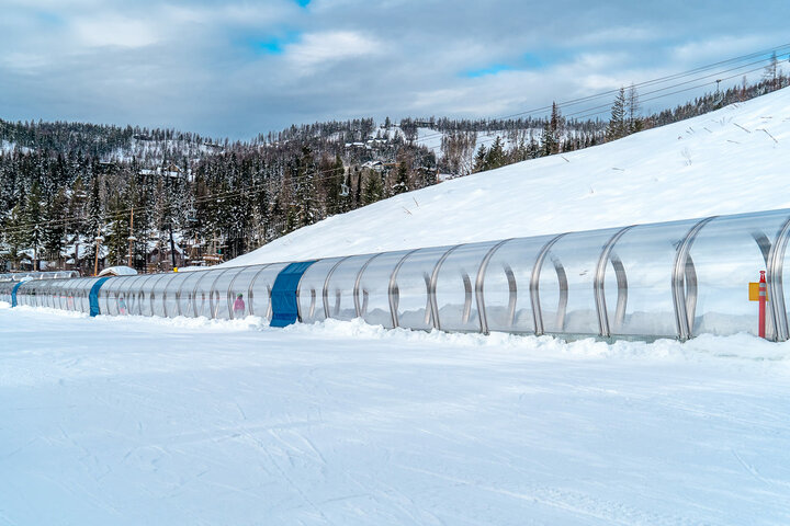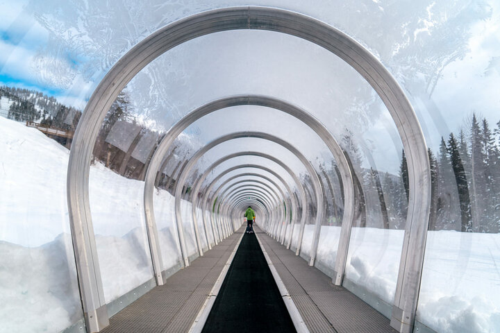 The EVOLUS-M gallery offers all beginner skiers a comfortable ascent protected from wind and weather. It also allows the operator to start operations quickly in the morning thanks to double doors at the bottom and top stations - without having to clear snow from the conveyor belt. The customer opted for split gallery arches to optimize international delivery (Austria - USA) and to simplify assembly. In addition, the entire exit area, including the drive station and operating terminal, is covered with a larger EVOLUS XL gallery.