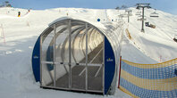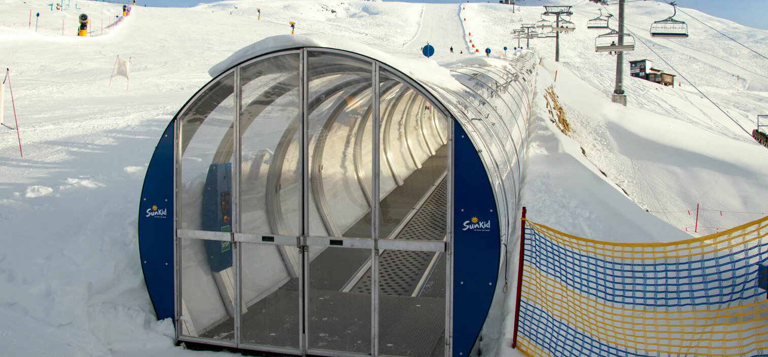 The modern conveyor belt of the current Sunkid Type N generation ensures a safe and easy introduction to skiing and snowboarding: The 75 centimeter wide endless belt with "Blue Eye" surface offers the best grip in all conditions. The EVO N gallery covers the entire length of the conveyor belt and protects both passengers and conveyor belt components from the wind and weather. Easy-to-lock hinged doors at the top and bottom of the gallery also prevent snow from entering when not in use.