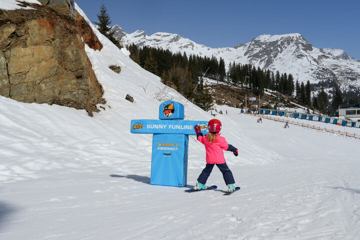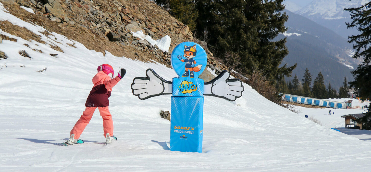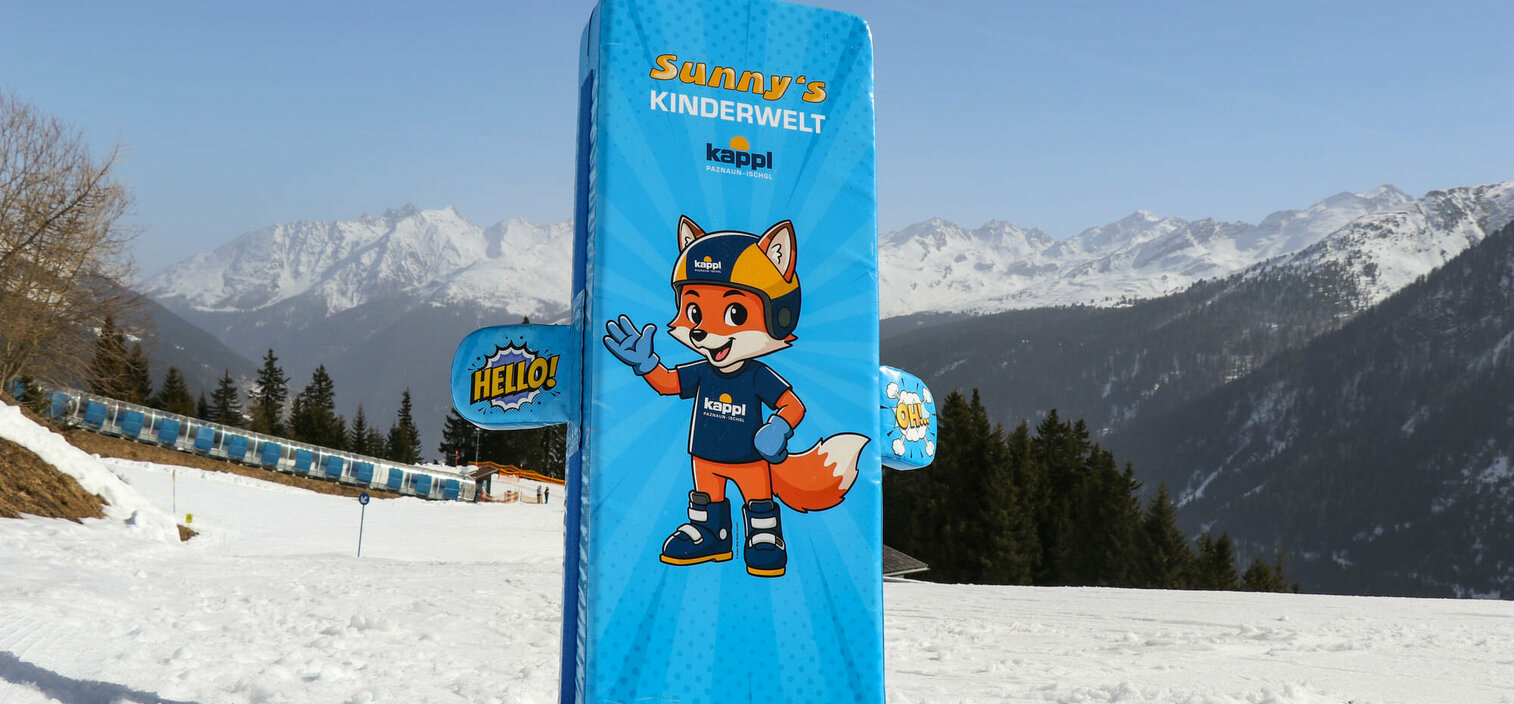 The new mascot of the Kappl ski area, the fox "Sunny", not only beams at young guests from the gondolas of the new Diasbahn, but also adorns many interactive elements of the new Funline.